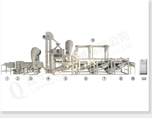 ① 上料斗② 原料提升機 ③ 多功能除雜機 ④ 斗式提升機 ⑤ 脫殼、風選、分選主機 ⑥ 籽仁復選機1 ⑦ 籽仁復選機2 ⑧ 籽仁復選機3 ⑨ 風力回料系統 ⑩ 接料斗 (11) 電氣控制柜